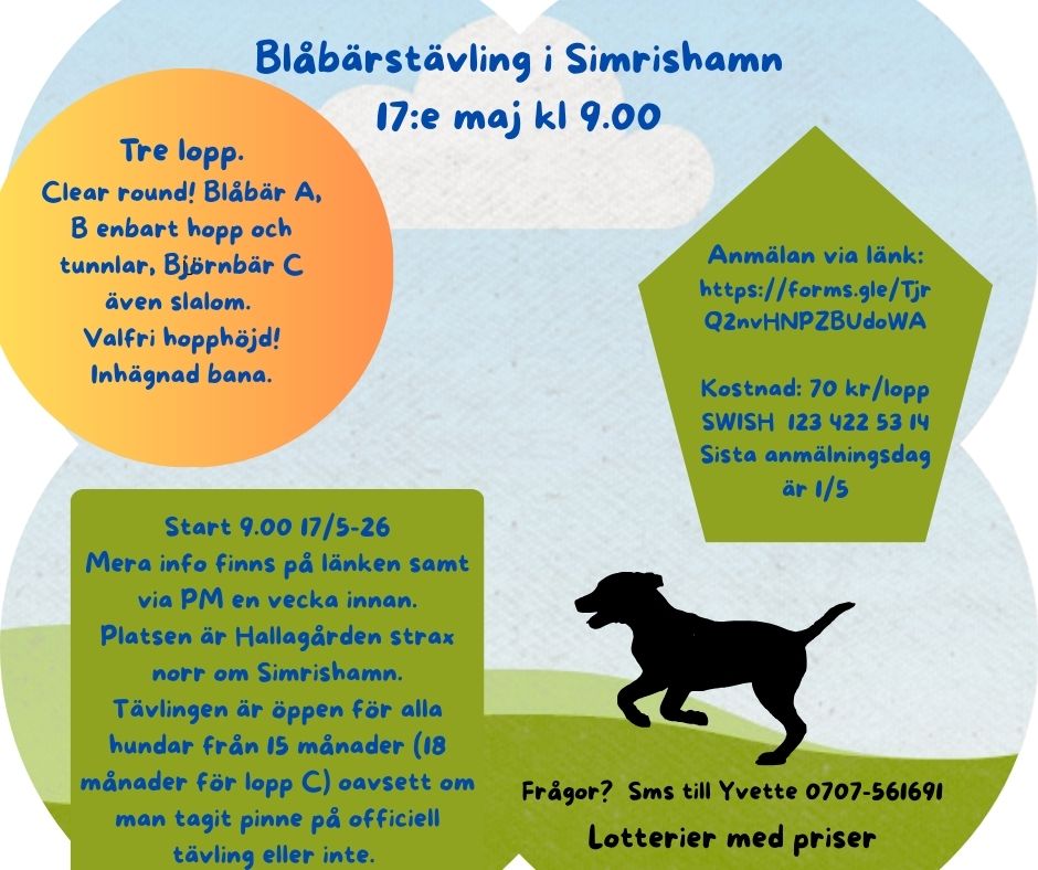 Start: 8/5, 2026 Vad: Rallykurs för nybörjare Antal tillfällen: Helgkurs Tid: 8/5, 9/5 och 10/5 Fredag kl.18.00-20.15. Lördag och söndag kl. 09.00- 15.00. Plats: Hallagården Max antal deltagare: 5 Pris: 1300 kr + ev medlemsavgift. Medlemsregistrering görs på brukshundklubben.se Avgiften betalas i samband med registreringen. Kursledare: Helen Mårtensson Anmälan: Görs via mejl till Helen Mårtensson Övrigt: Ta med gott belöningsgodis och koppel/sele (ej flexi).